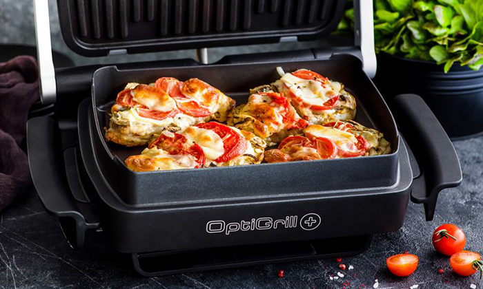 Descoperă OptiGrill+ XL Snacking & Baking, cu un mod manual care dispune de 4 niveluri de temperaturi, 3 programe noi automate de gătit pentru opțiuni nelimitate și o suprafață de 800 cm2, pentru a putea servi de la 6 până la 8 persoane deodată. Datorită senzorului automat pentru gătit, OptiGrill+ detectează imediat numărul de porții de pe suprafața de gătit și grosimea lor, reglând automat temperatura și durata de preparare pentru rezultate perfecte de fiecare dată.