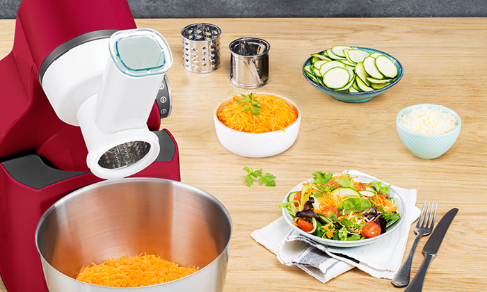 - 3 accesorii: blender 1 L, mașină de tocat carne și feliator