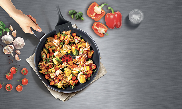 Thermo-Signal™Acesta devine roșu intens atunci când tigaia atinge temperatura ideală pentru gătit, garantând astfel textura, gustul și culoarea perfectă pentru mese delicioase în fiecare zi.